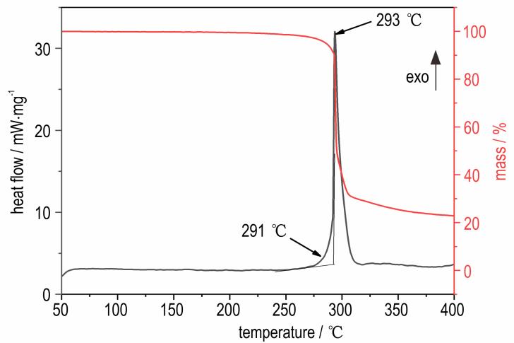 1 ),产率高达89.3%。采用核磁共振、红外光谱和X射线单晶衍射对目标化合物进行结构表征。化合物1 晶体属于单斜晶系,C2/c空间群,室温下的单晶密度为1.774 g?cm-3。使用EXPLO5软件计算其爆轰性能,同时利用热重-差示扫描量热联用仪和撞击/摩擦感度仪测试其热分解温度与机械感度,结果表明化合物1 的起始热分解温度为303 ℃,根据实测密度计算的爆速和爆压分别为7680 m?s-1和22.7 GPa,撞击感度和摩擦感度分别大于60 J和大于360 N,是一种有潜在应用价值的耐热不敏感炸药分子。
