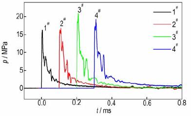 图 2 四种乳化炸药冲击波压力时程曲线 Fig.2 Pressure-time curves of four different emulsion explosives |
