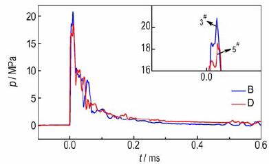 图 3 两种乳化炸药冲击波压力时程曲线 Fig.3 Pressure-time curves of two different emulsion explosives |