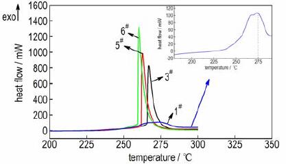 乳化炸药作为爆炸危险品蕴藏着巨大的能量而处于亚稳态状态, 一旦受到外部刺激其内部就会发生热分解反应在短时间内释放大量的热, 倘若热量大量聚积其中不能及时释放就会发生爆炸等严重后果。所以在提高乳化炸药爆轰性能的同时, 对其热分解特性的研究不容忽视。为此利用微量量热仪对1#、3#、5#、6#样品进行热分析实验, 其结果如图 6所示。由图 6得到的乳化炸药热力学参数以及计算得到的动力学参数[18]列于表 4。